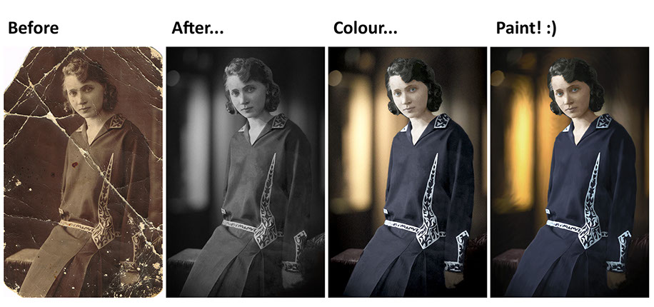 Najpierw koloryzacja i rekonstrukcja, później nadawanie kolorytu i przeciągnięcie całości pędzlem. Trochę jak malowanie obrazu od początku, ale efekt wyszedł całkiem ciekawy. Szczególnie po wydruku na płótnie. Okazał się to doskonały prezent dla babci pod choinkę. Nie obyło się bez łez wzruszenia...