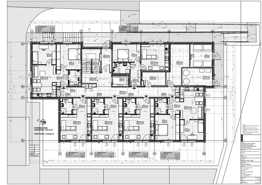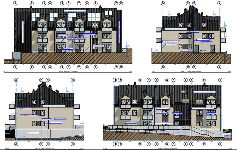 Każdy pakiet mieszkaniowy zawierał rzuty z instalacjami wodno-kanalizacyjnymi, aranżacją meblową, wykończeniem ścian, wykończeniem podłóg, instalacjami elektrycznymi. Do tego rzuty plus rozwinięcia ścian pomieszczeń charakterystycznych: łazienek i kuchni. W przypadku tego zlecenia postanowiłem przygotować całość w jednym pliku ArchiCAD, bez rozbijania na pojedyncze pliki po jednym na mieszkanie. Dzięki temu udało się stworzyć spójną dokumentację obejmującą ponad 600 arkuszy w publikatorze!