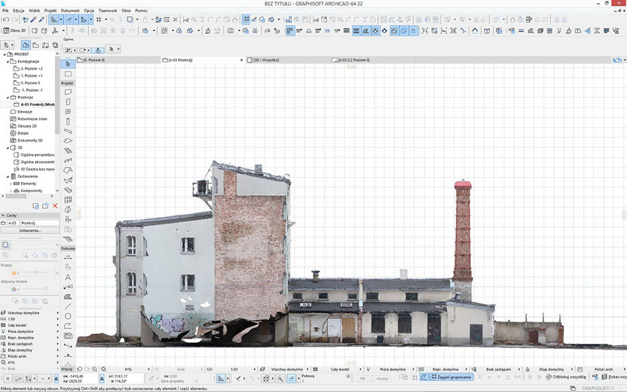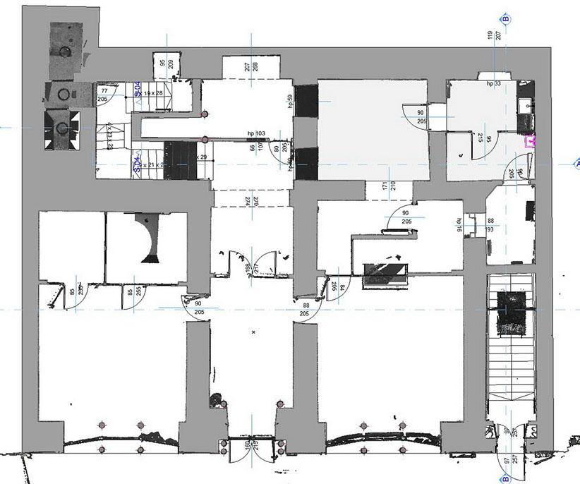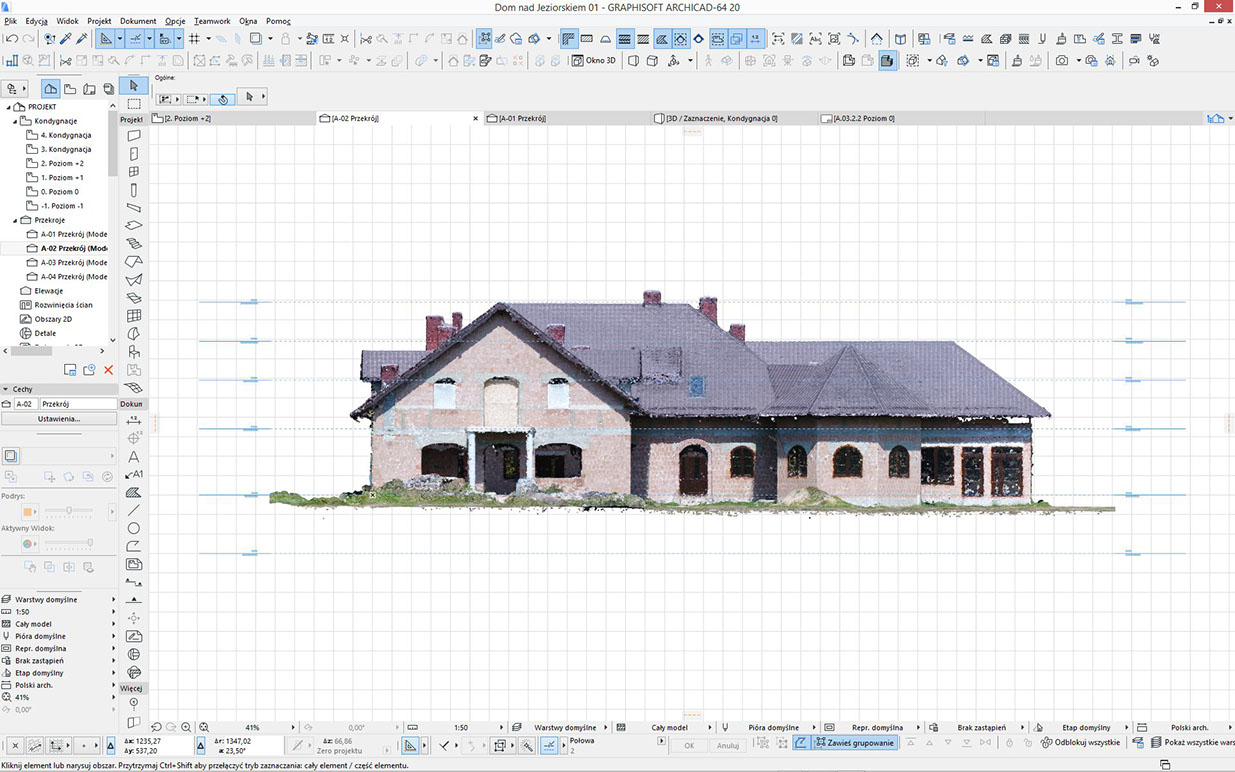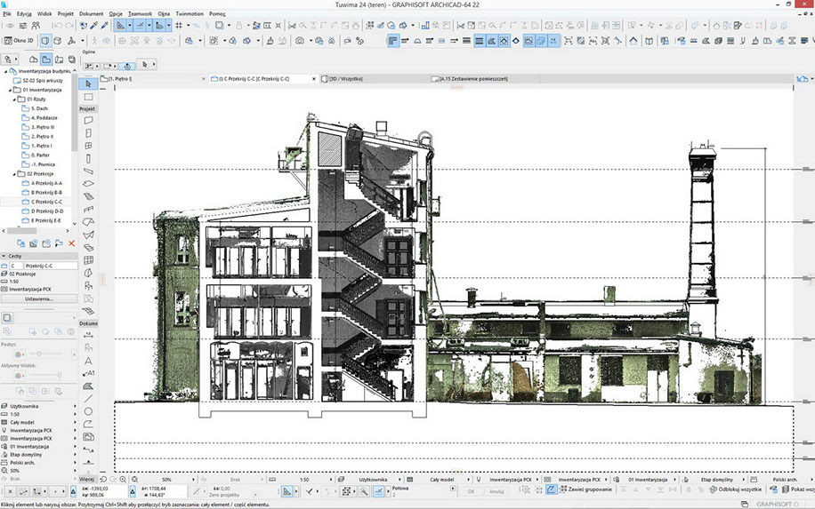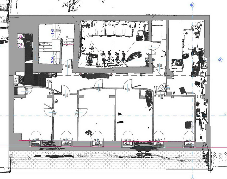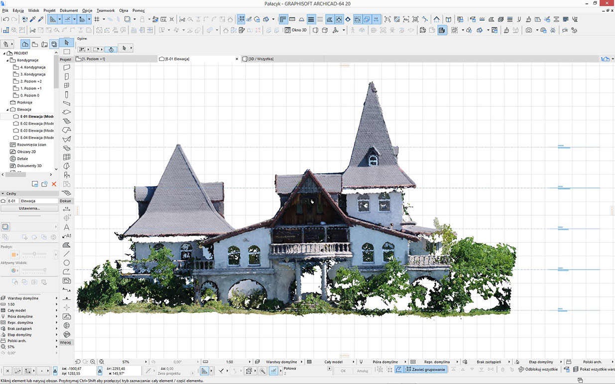 Chmura punktów służy za podstawę do tworzenia na jej bazie precyzyjnego modelu BIM, z którego otrzymujemy całą dokumentację techniczną: rzuty, przekroje, elewacje.