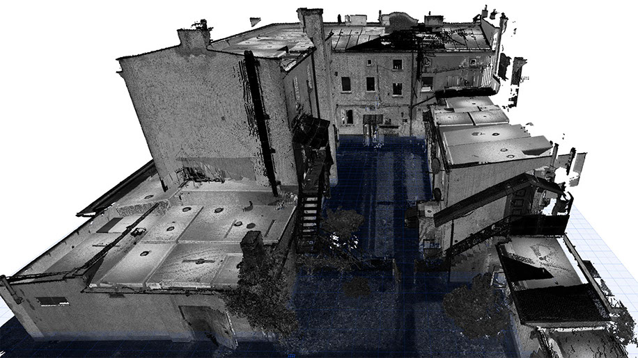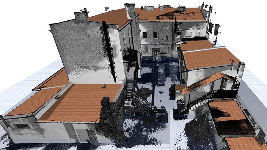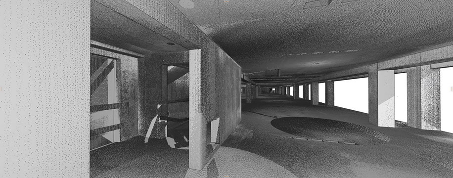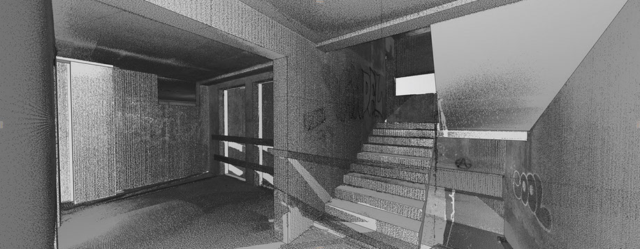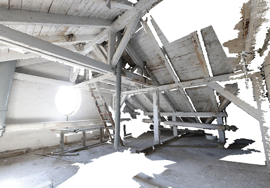 Laserem skanujemy obiekt z zewnątrz jak i wewnątrz, natomiast fotogrametrią wspieramy tworzenie chmur zewnętrznych miejsc ciężko dostępnych np.: dachów.